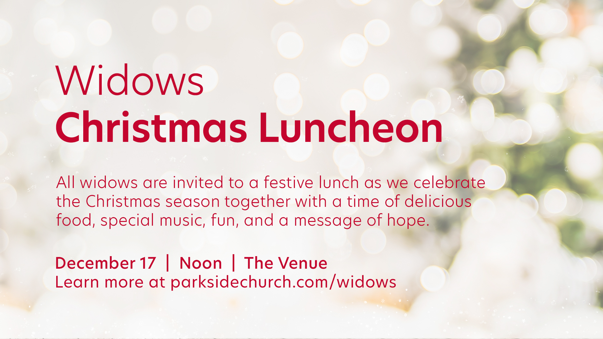 All widows are invited to a festive lunch as we celebrate the Christmas season together with a time of delicious food, special music, fun, and a message of hope on Sunday, December 17, at noon in the Venue.