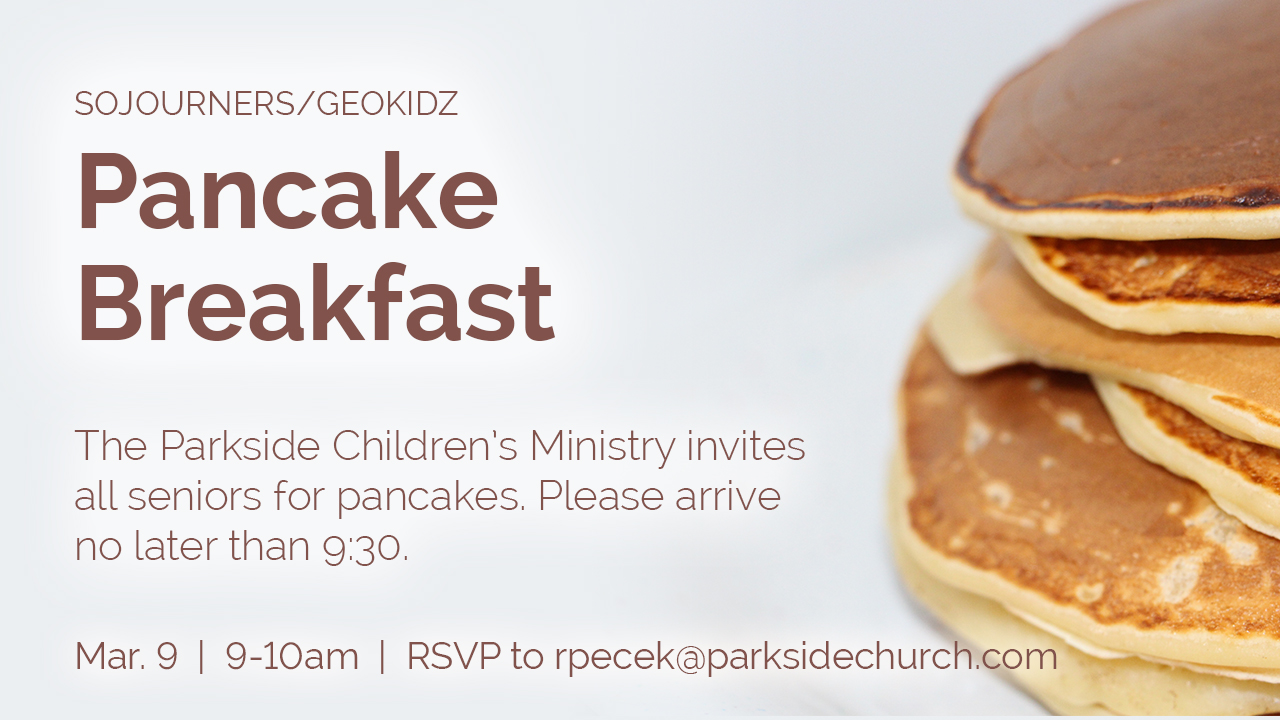 If you are an older adult, you are invited to the Sojourners/GEO Kidz Pancake Breakfast on March 9 at 9am in the Venue. Breakfast is usually served between 9:10-9:45am with a brief program by our children before we conclude the morning. The breakfast is free and we ask that you RSVP to Renee Pecek by March 7 if you plan to attend.