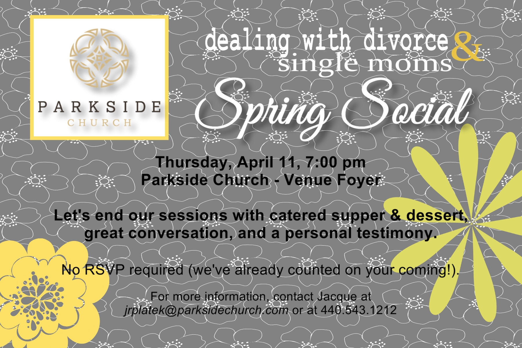 The Dealing with Divorce and Single Moms care groups will hold a combined social on Thursday, April 11. Join us for dinner and a time of fun and fellowship at 7:00 pm in the Venue Foyer. There is no cost to attend. Childcare is available.