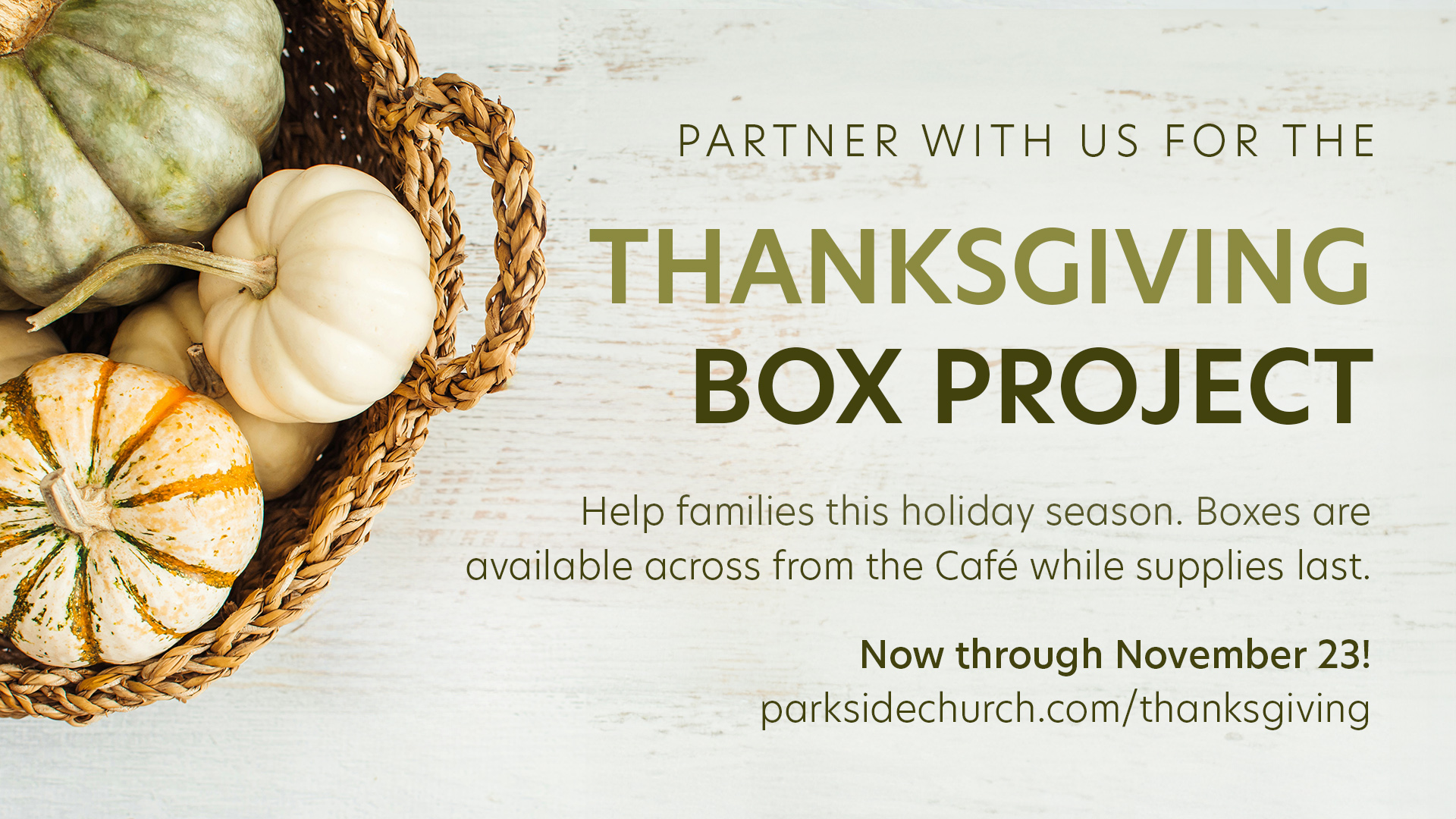 Help cover the cost of the turkey given to each family with their dinner box. Make your check payable to Parkside Church, with “Box Project” on the memo line, or give online and designate “Thanksgiving/Christmas Benevolence."