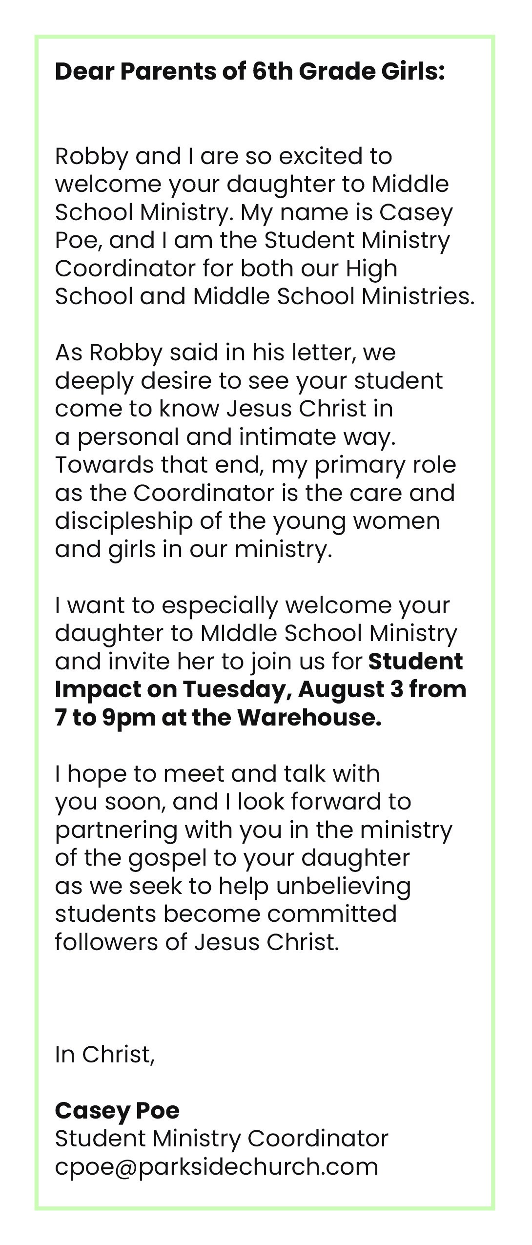 - Read a welcome letter from our MS Pastor, Robby Lacey