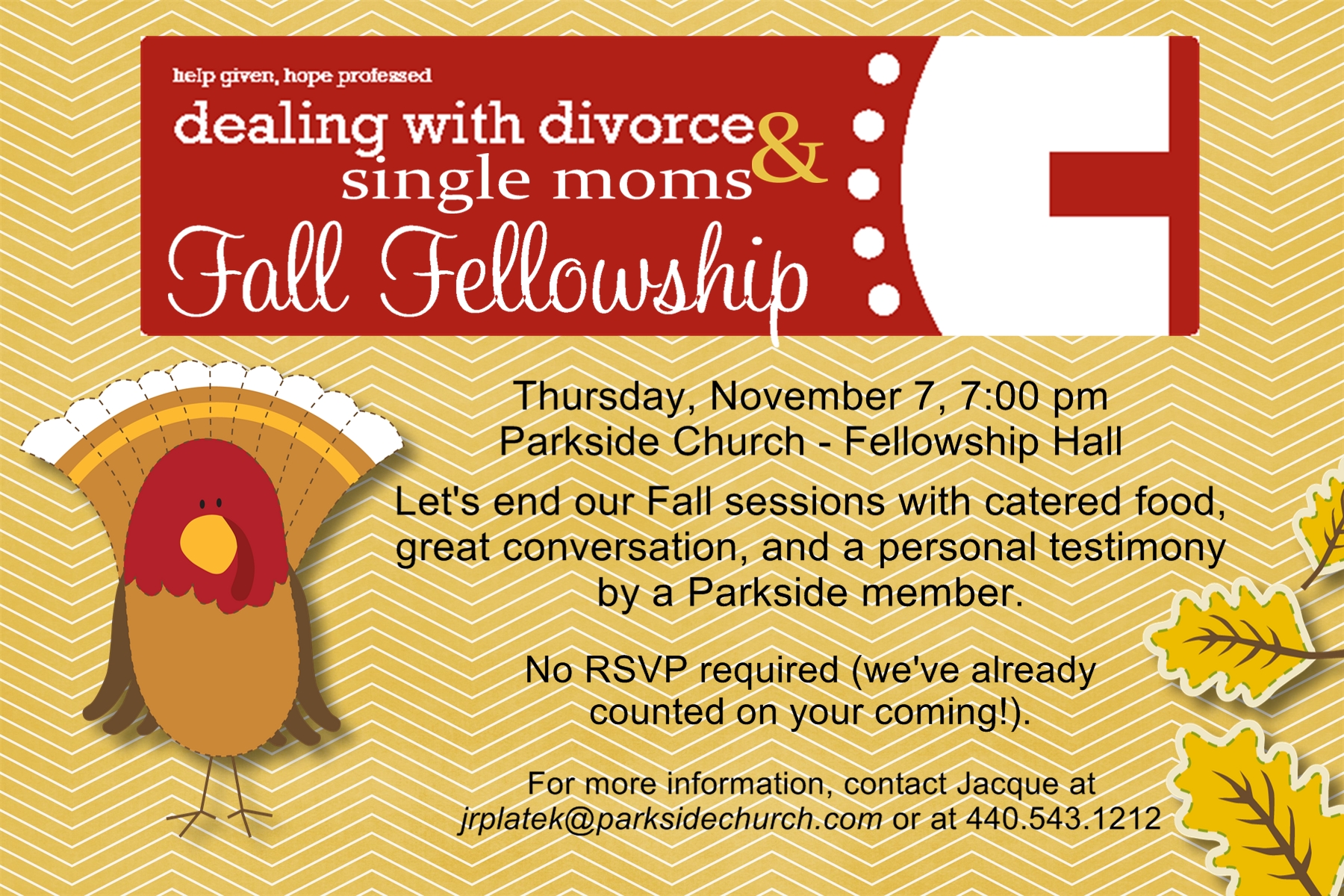 Join us this Thursday, November 7 at 7:00 pm in the Fellowship Hall for a time of fun, catered appetizers, and a personal testimony from a Parkside member. No need to RSVP. Download the invitation here.
